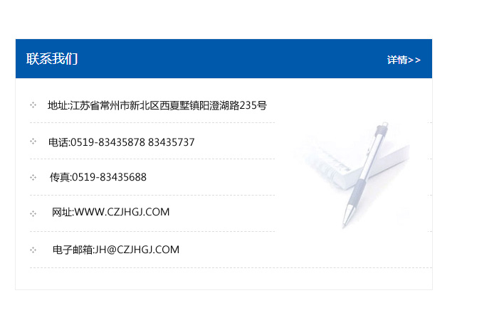 地址:常州市新北區友邦商務大廈1幢16、17層  電話:0519-85101652  傳真:0519-85112595  郵編:213022  網址:www.cz-jiayue_cn.tyyybj.com  郵箱:xiajifengaa@163.com